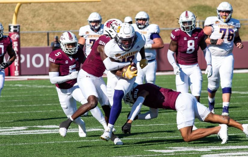 WIU wide receiver Naseim Brantley (18) fights for yardage Saturday after a reception against Southern Illinois. (Photo by SIUSalukis.com)