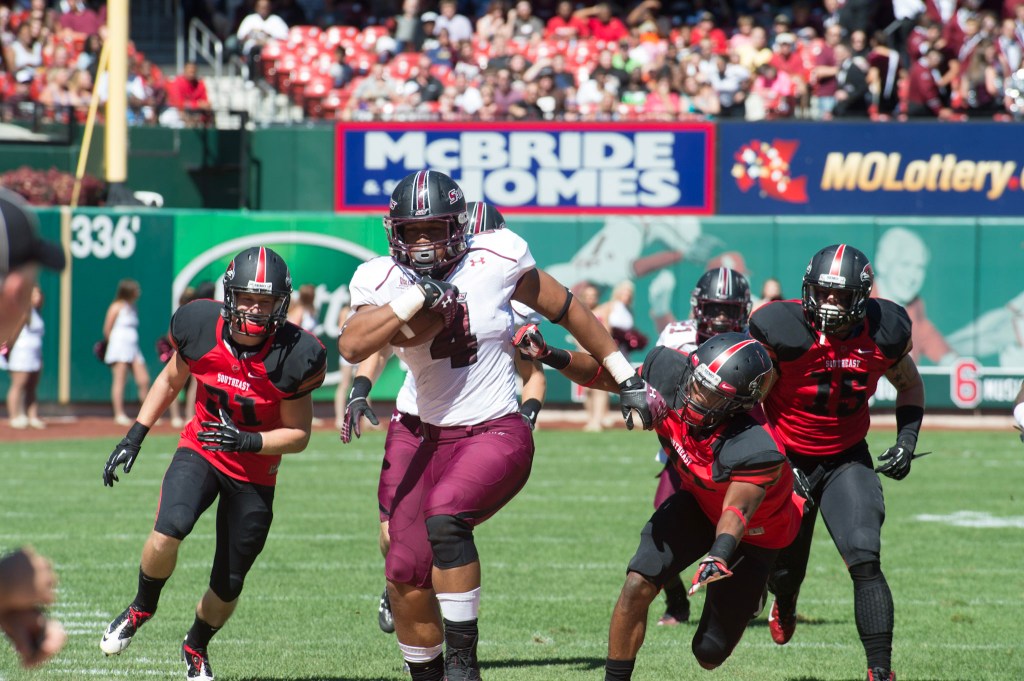 Sparked by running back Malcolm Agnew (31), the SIU Salukis rallied to defeat regional rival Southeast Missouri, 36-19, at Busch Stadium in St. Louis in 2013. (Photo by Saluki Communications)