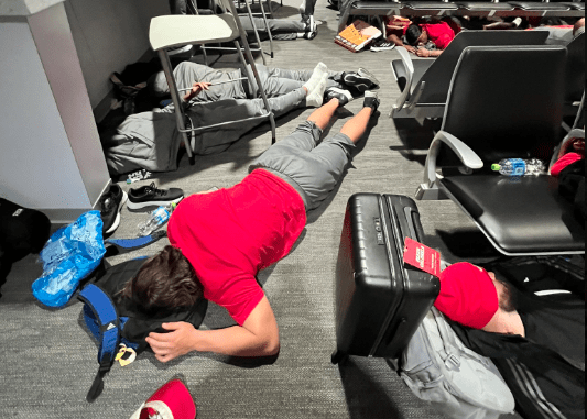 Nicholls athletic director Jonathan Terrell posted photos such as this on social media as the Colonels’ football team and staff endured a 22-hour stay at Veterans Airport in downstate Marion. (X/Twitter photo)