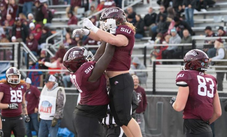 Aidan Quinn is lifted in the air by SIU offensive lineman Abdou Toure after Quinn’s 14-yard touchdown reception in the Salukis’ 35-0 playoff victory against Nicholls. (Photo by SIUSalukis.com)