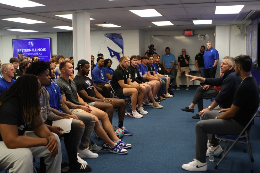 Senior Tre’Jon Lewis is one of EIU’s captains for this coming season. Not only did the defensive tackle from Texas sit in on the Friday meeting, but he also got to speak at the following day’s fundraiser held in Groniger Arena.