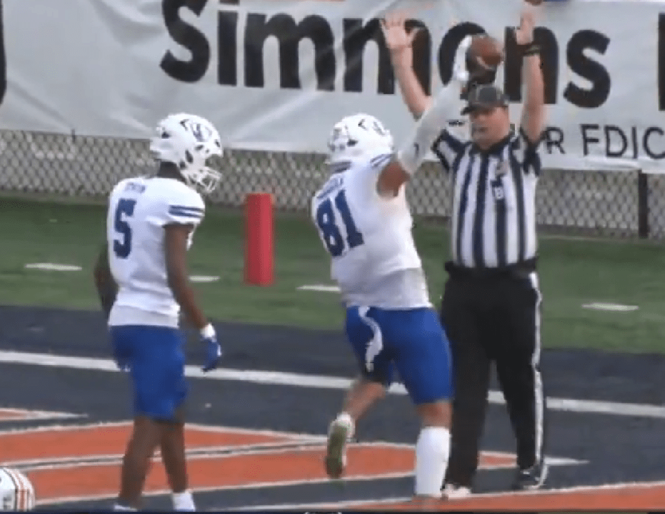 Eastern Illinois tight end Alex Herrera (81) celebrates his third-quarter touchdown while receiver Surahz Buncom (5) looks on. (Photo from ESPN-Plus)
