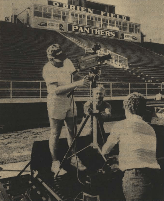 EIU’s audio visual department provided a camera for the day. The operator was decked out in an ESPN shirt and cap. A satellite dish was placed in the stadium parking lot.