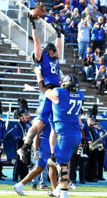 Alex Ginnever (87) is hoisted into the air by EIU teammate Sandro Malicevic after a touchdown catch Saturday. (Photo by Sandy King, EIUPanthers.com)