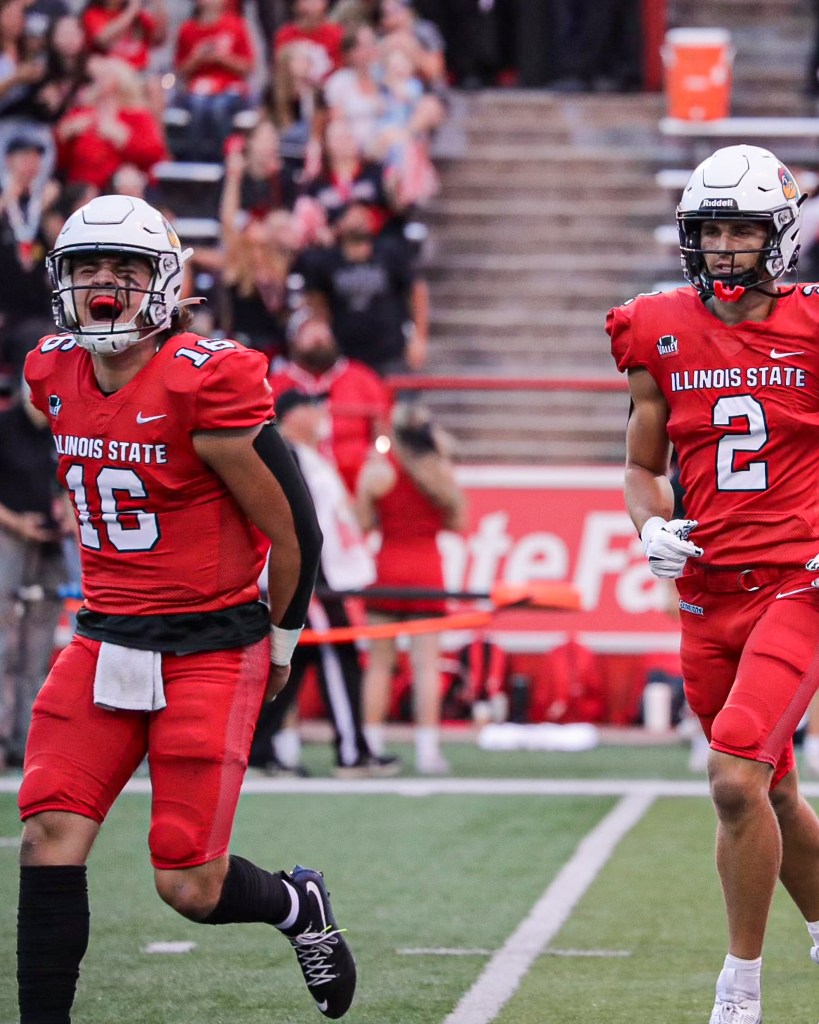 Tommy Rittenhouse (16) became the fourth player to throw for 3,000 yards in a season for Illinois State last weekend. His top target, Daniel Sobkowicz, owns two career records and has a third in his sights. (Photo by GoRedbirds.com)