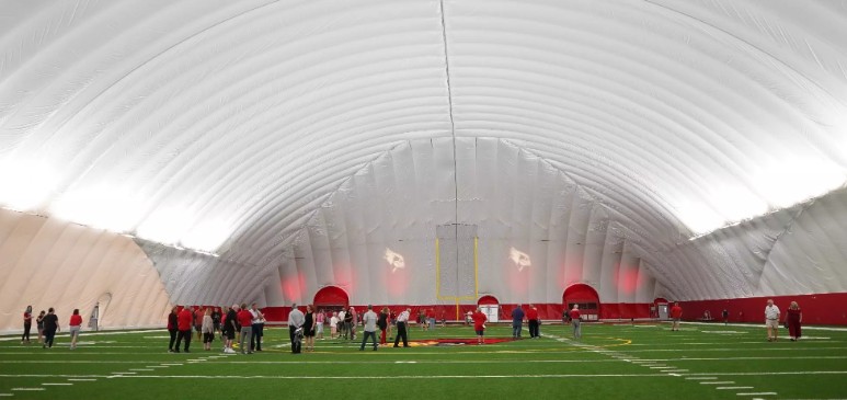 Opened in September 2023, the facility is a heated fabric air dome that can be used year-round. It features a 100-yard practice field with a single end zone and the artificial turf surface matches that of Hancock Stadium.